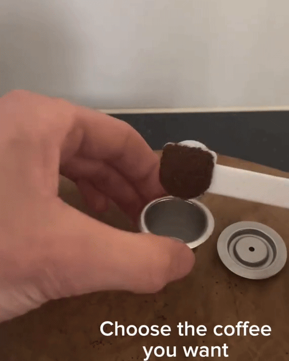 Remplissez, tassez, insérez. En 30 secondes, votre café est prêt — sans plastique, sans stress